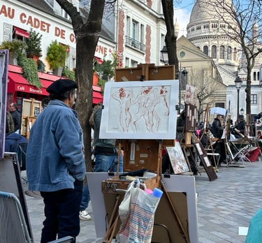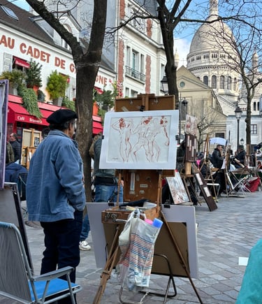 We tour the city in classic open-roof Citroën 2CVs, champagne in hand, gliding past the Eiffel Tower, Notre Dame, and the Arc de Triomphe. In Montmartre, we settle into our first exclusive Sit & Stitch session in the iconic Place du Tertre, surrounded by local artists. The day continues with Sacré-Cœur, charming side streets, and a visit to the opulent Palais Garnier.